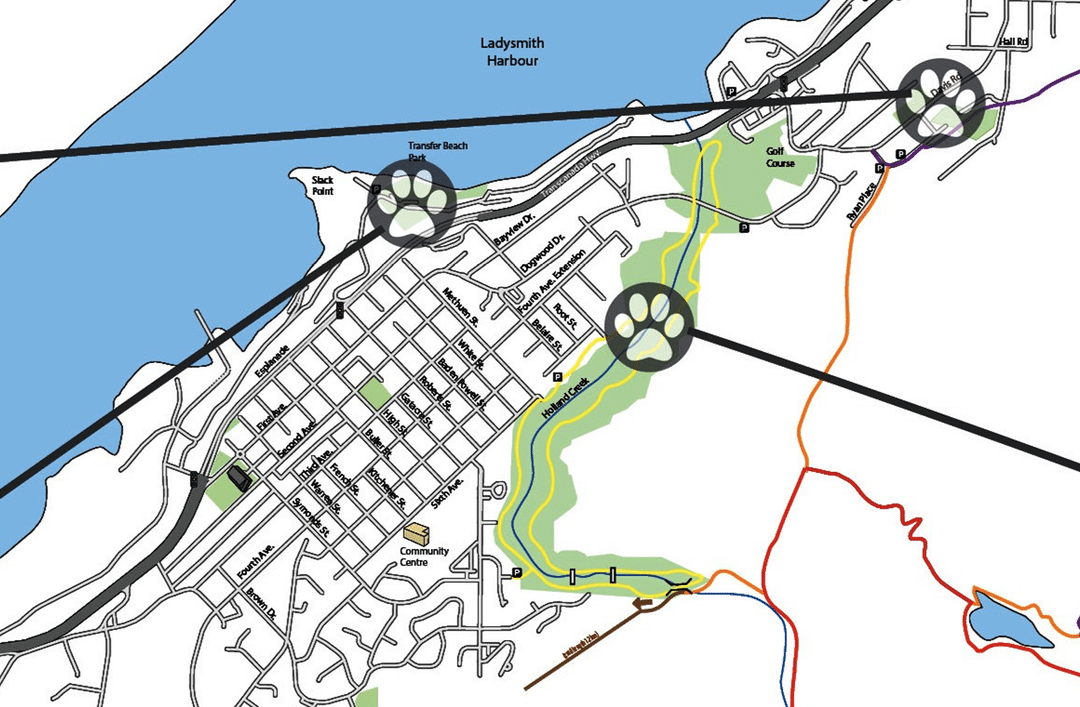 The Holland Creek Trail in Ladysmith, British Columbia, is a dog friendly, off-leash trail loop which is approximately 6 KM long.